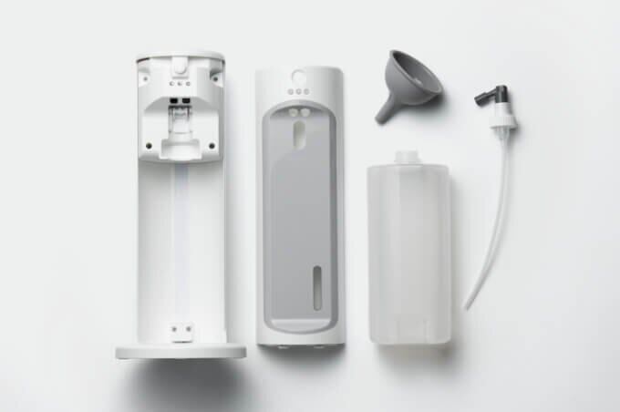 本体、ろうと、消毒液ノズル、ボトル(本体内蔵)、取扱説明書(保証書付)